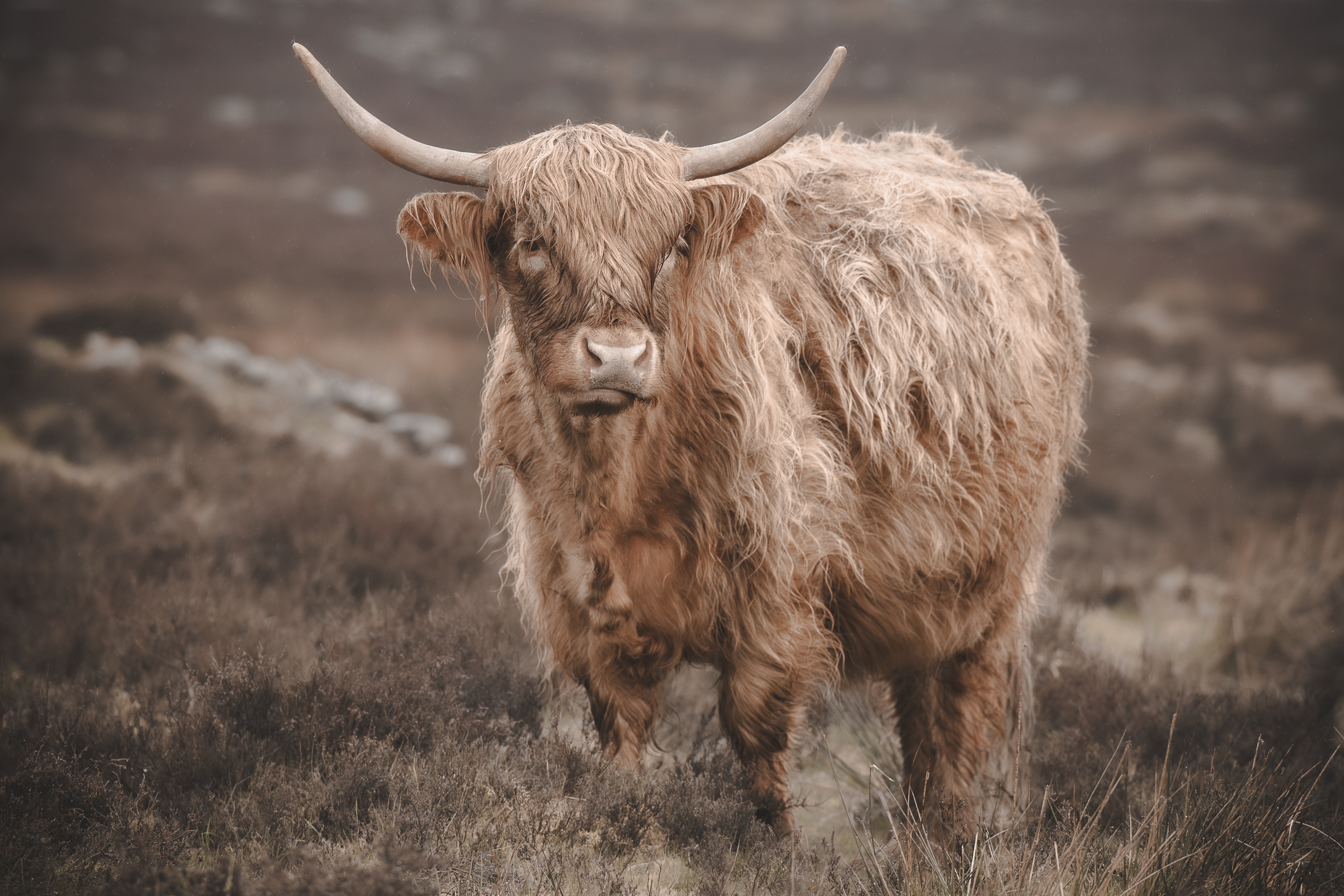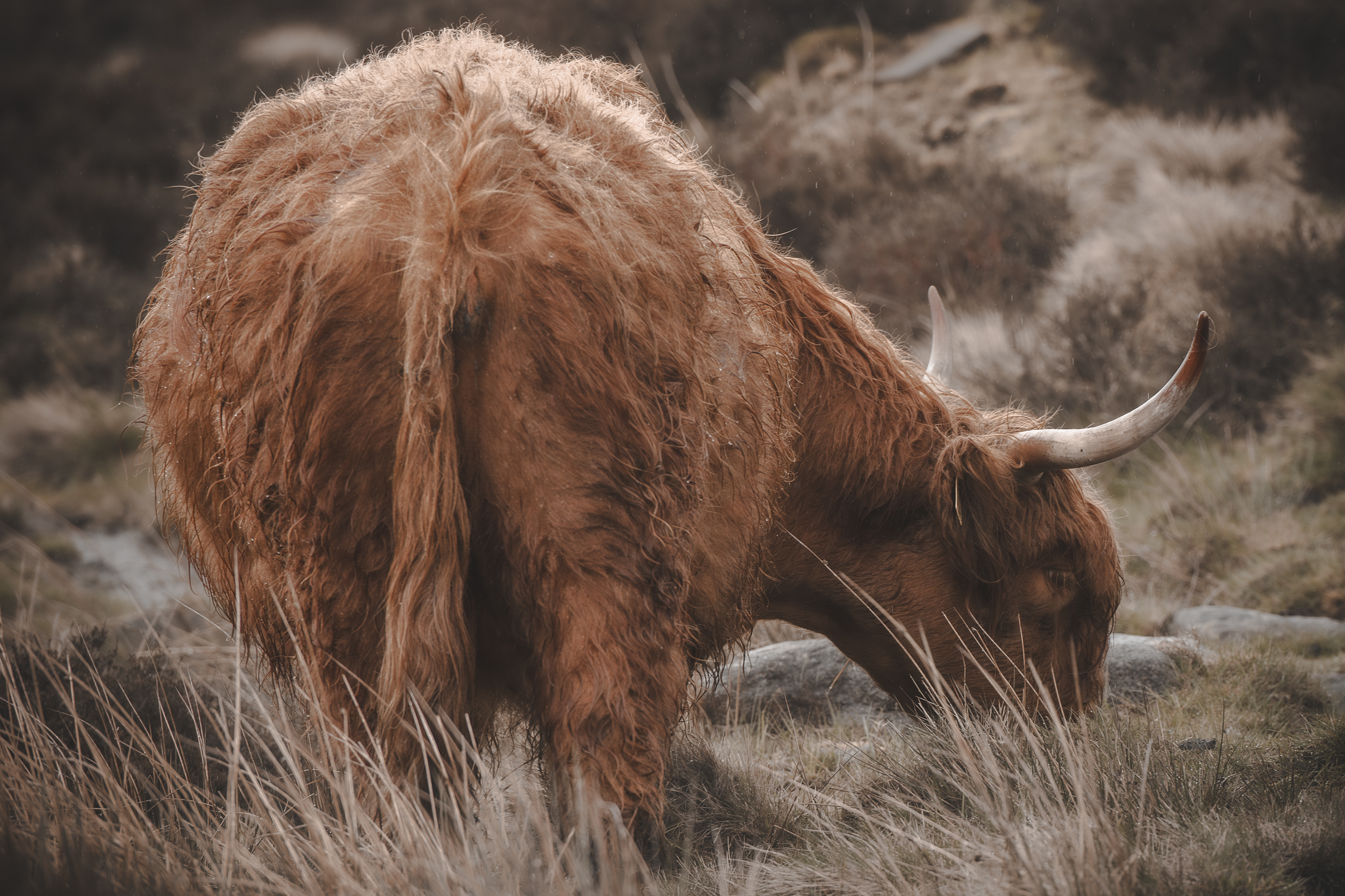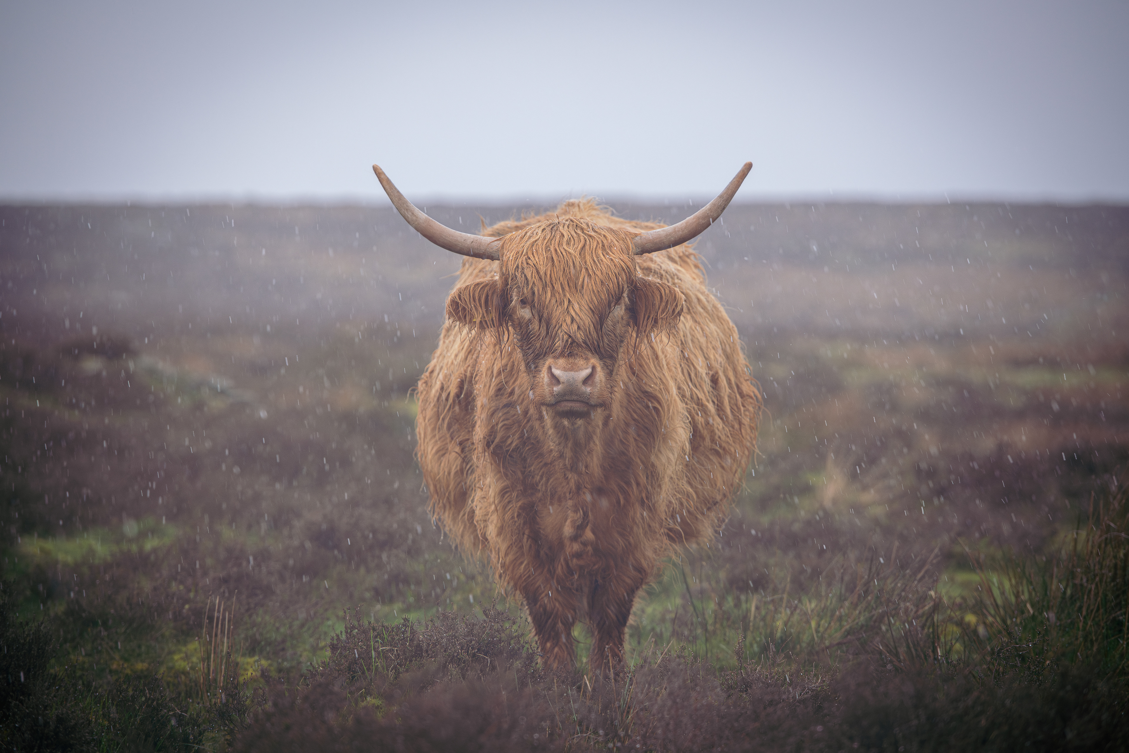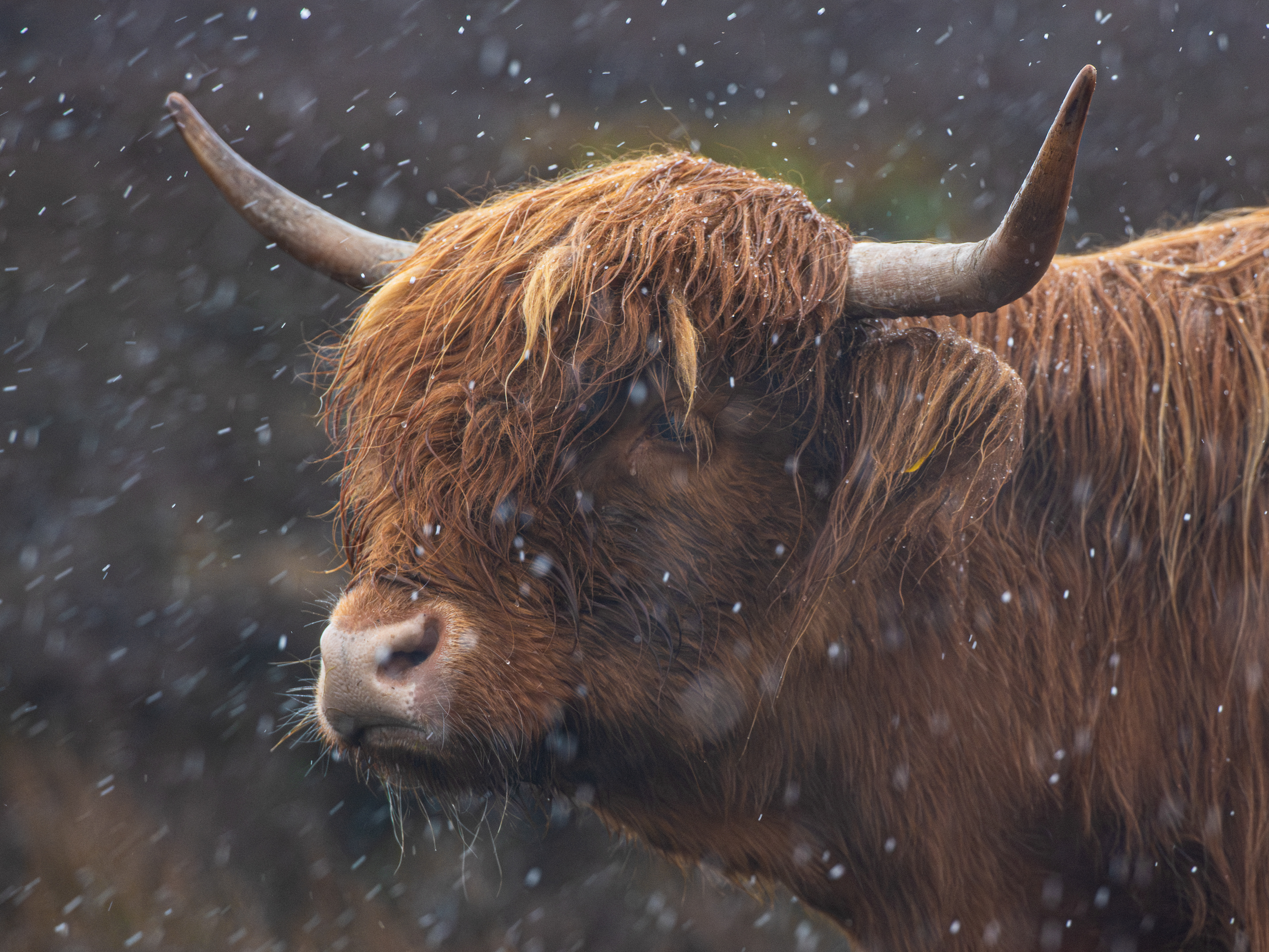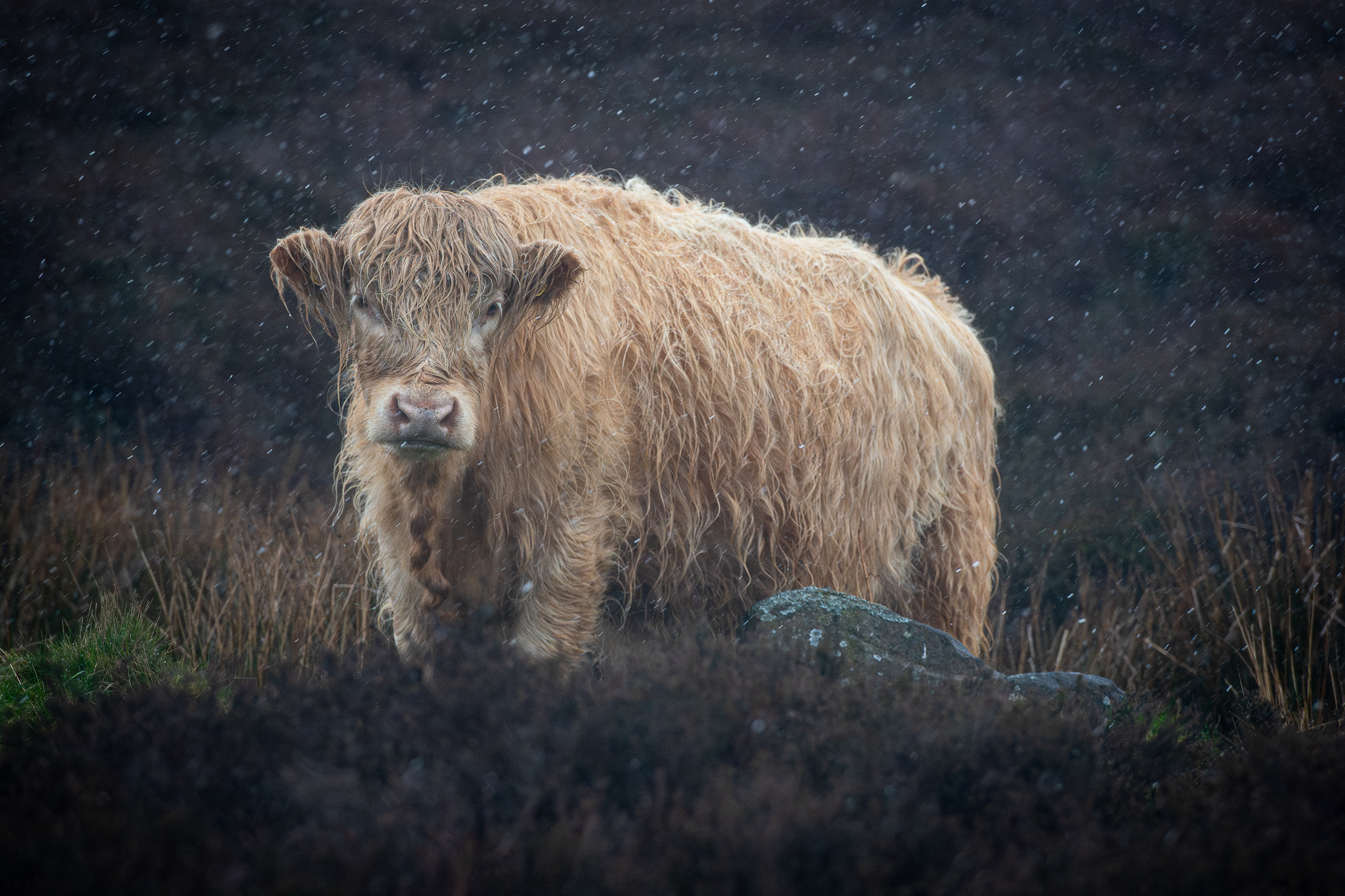 Highland coos in the middle of a hale storm
